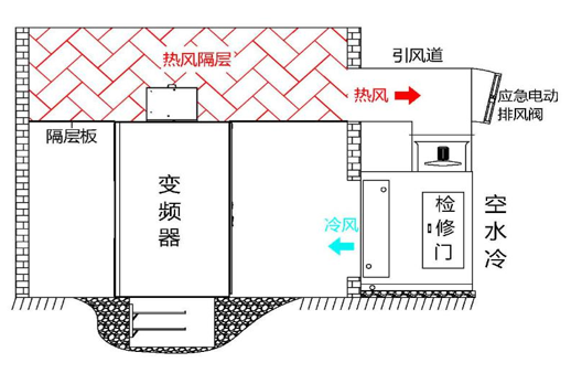 變頻器柜頂與電氣室天花板之間制作吊 頂隔層收集柜頂風(fēng)機(jī)排出熱風(fēng),在四側(cè) 墻上開(kāi)孔通過(guò)引風(fēng)道將吊頂隔層內(nèi)熱風(fēng) 引至安裝在室外空水冷設(shè)備冷卻后回至 變頻室內(nèi)。