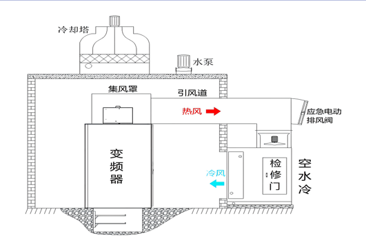 變頻器柜頂制作安裝集風(fēng)罩,收集柜頂風(fēng)機(jī)排 出熱風(fēng),通過(guò)引風(fēng)道將熱風(fēng)引至安裝在室外空水冷 設(shè)備,冷卻后回至變頻室內(nèi)。